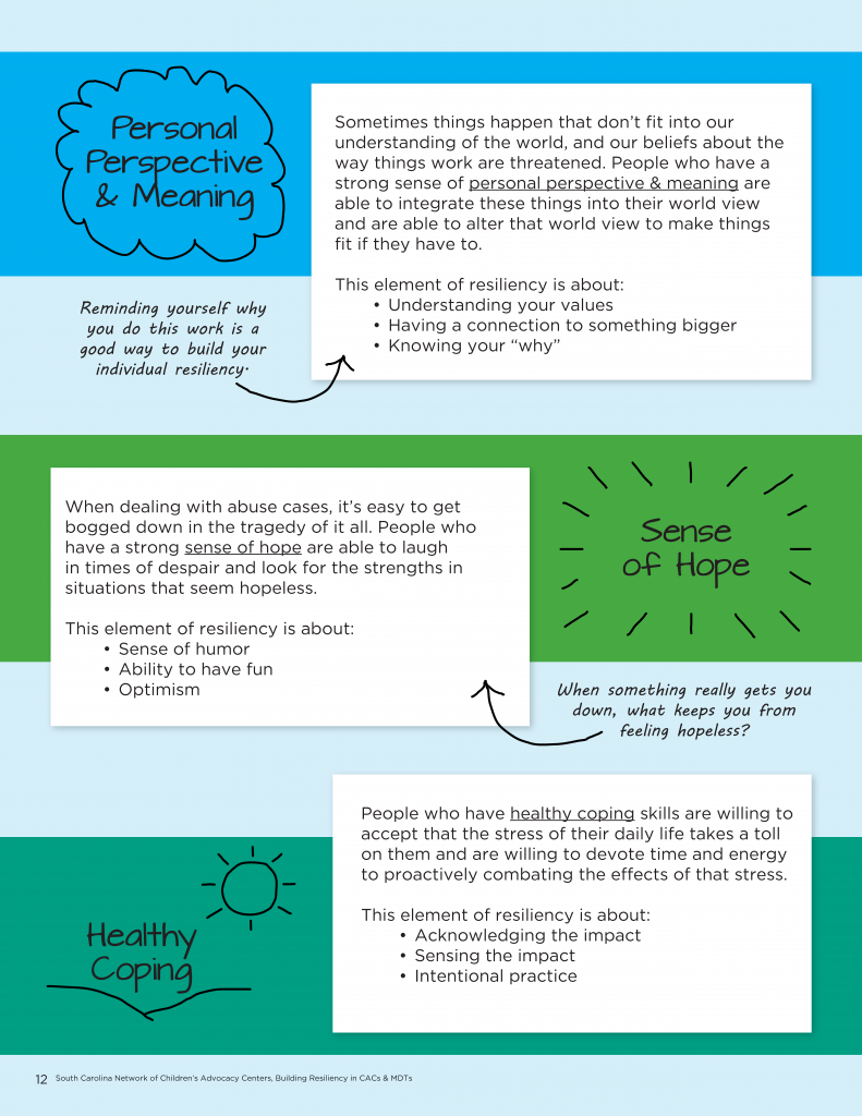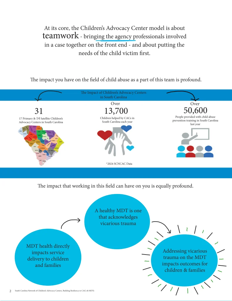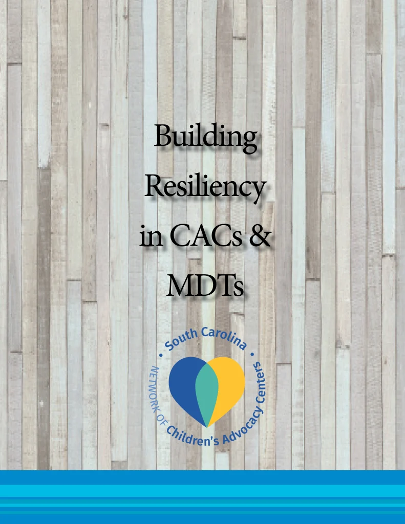 The Building Resiliency in Children’s Advocacy Centers (CACs) & Multidisciplinary Teams (MDTs) training curriculum was adapted by the South Carolina Network of Children’s Advocacy Centers from the “Building Resiliency in Child Abuse Organizations” curriculum developed by the Office for Victims of Crime. The purpose of this training is to strengthen the capacity of South Carolina’s Children’s Advocacy Centers by educating CAC staff and multi-disciplinary team members on the impact of working in this field and by promoting resilience-building on a team level. This training also assists CACs in meeting resiliency training requirements in the National Children’s Alliance accreditation standards.