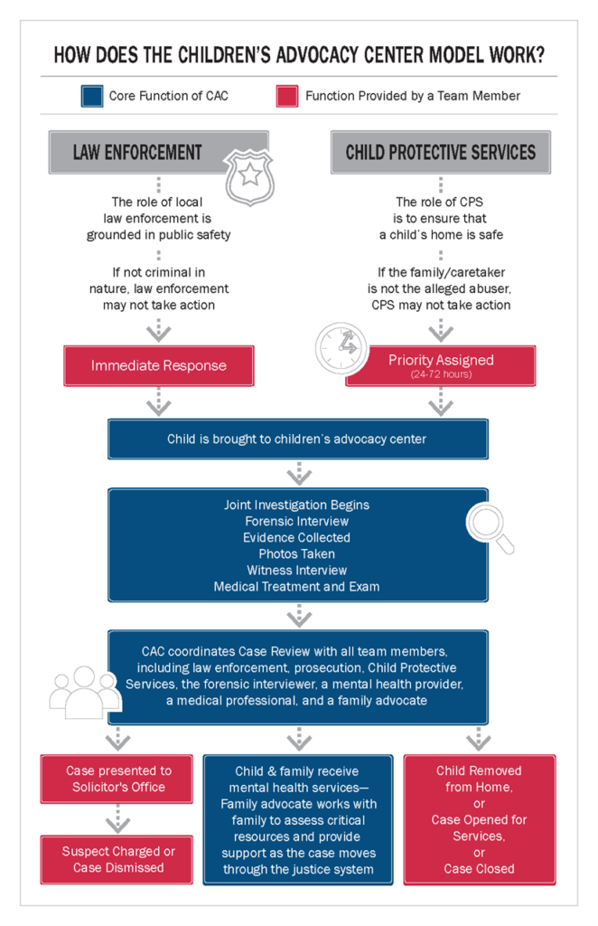 When police or child protective services believe a child is being abused, the child is brought to the CAC—a safe, child-focused environment—by a caregiver or other “safe” adult. At the CAC, the child tells their story once to a trained interviewer who knows the right questions to ask in a way that does not retraumatize the child. Then, a team that includes medical professionals, law enforcement, mental health, solicitor’s office, child protective services, victim advocacy, and other professionals make decisions together about how to help the child based on the interview. CACs offer therapy and medical exams, plus courtroom preparation, victim advocacy, case management, and other services. This is called the multidisciplinary team (MDT) response and is a core part of the work of CACs do in South Carolina.