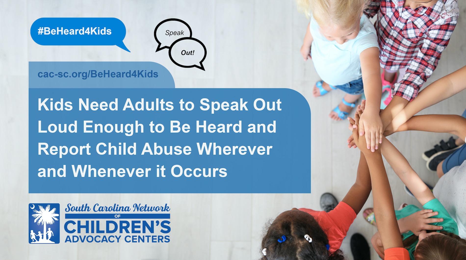 Adults need to know what to do if they observe child abuse/neglect or if a child discloses that they have been harmed. #BeHeard4kids shines a light on child abuse by encouraging adults to be heard for kids and report abuse. We want to empower South Carolina adults to help create safer childhoods for all children! South Carolina adults can all #BeHeard4Kids!
